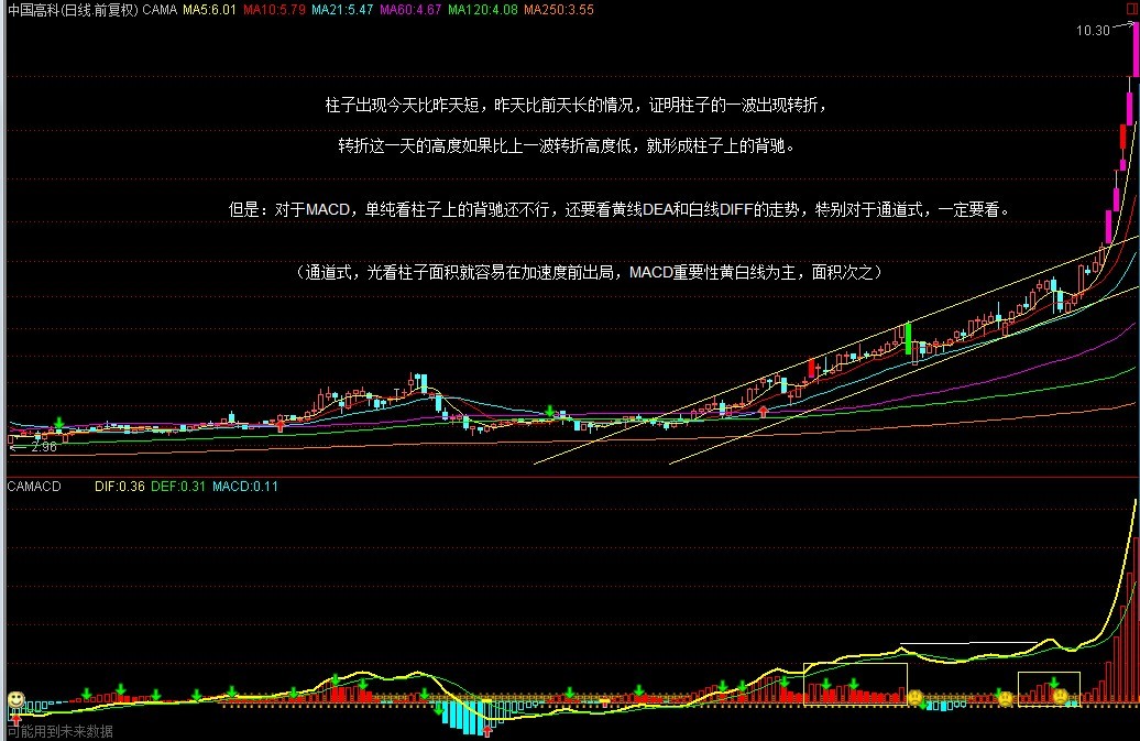 第二种情况暂且不说,第一种情况,最大的标志就是所谓的“背驰”了。必须注意:没有趋势,没有背驰。在盘整中是无所谓“背驰”的,这点是必须特别明确的。还有一点是必须注意的,这里的所有判断都只关系到两条均线与走势,和任何技术指标都无关。
