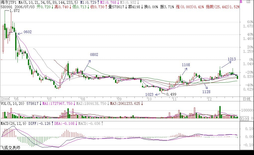 纯粹的两条均线的K线图,就足以应付最复杂的市场走势了。当然,如果没有这样的看图能力,可以参照一下技术指标,例如MACD等,关于各技术指标的应用,以后会陆续说到。