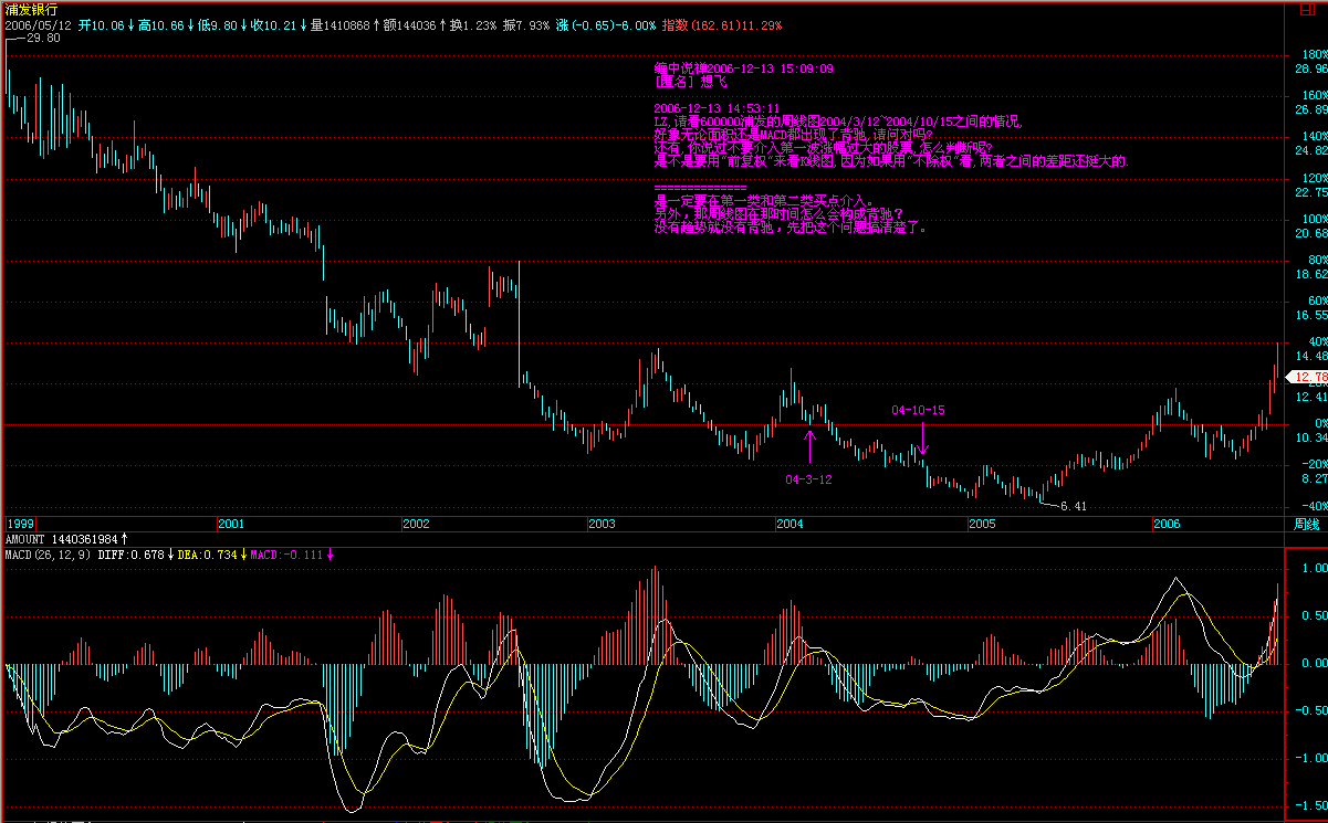LZ,请看600000浦发的周线图2004/3/12~2004/10/15之间的情况,好象无论面积还是MACD都出现了背驰,请问对吗?