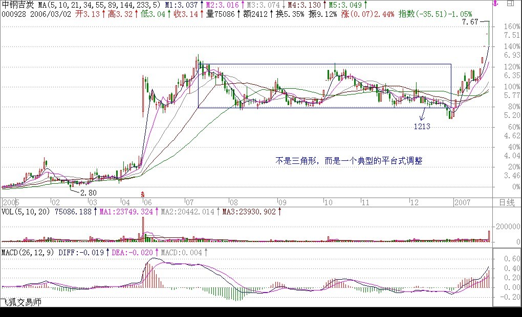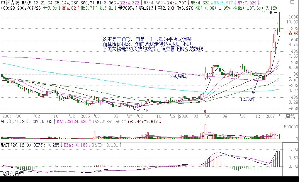 这不是三角形,而是一个典型的平台式调整。而且恰好相反,他的周线走得还可以,不过下面关键是250周线的支持,该位置不能有效跌破。