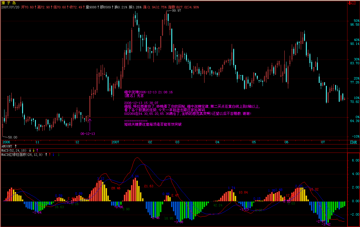 缠姐,特拉感谢你了,昨晚看了你的回帖,缠中说蝉定律,第二买点在黄白线上到0轴以上,看了各个股票的走势,今天一早就进去跟庄家抢筹码.002069在64.30,65.20,65.36满仓了,坐轿的感觉真爽啊!还望以后不吝赐教.谢谢!